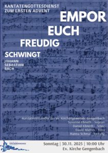 Kantatengottesdienst zum ersten Advent mit dem Kantatenensemble der ev. Kirchengemeinde Gengenbach | Susanne Ebneth - Sopran | Daniel Ebneth - Tenor | David Mathis - Bass | Leitung - Hanna Schmal